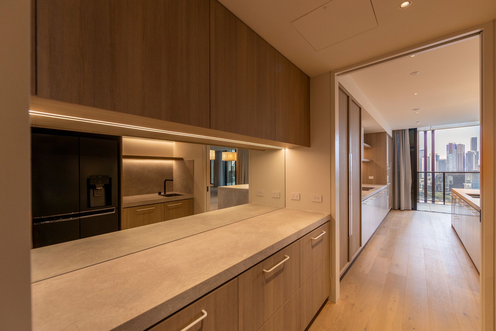 The Grace Penthouse project involved the high-level fit-out of a luxury penthouse located at the edge of the F1 track in Melbourne Albert Park. This two-level penthouse boasts breathtaking views, with the front facing Albert Park Lake and the back offering stunning views of the Melbourne CBD. The fit-out was completed within a concrete shell, emphasising high-end finishes and a sophisticated outdoor garden area. A significant challenge was the installation of a two-level lift procured from Greece, Cyprus. Initially intended to be shipped by boat, it had to be flown over due to time constraints. Coordinating the 17-storey crane lift with the council required months of meticulous planning, as the adjoining building did not permit the lift to be conducted over their property, necessitating repositioning of the crane. The entire lift operation took 12 hours to complete.