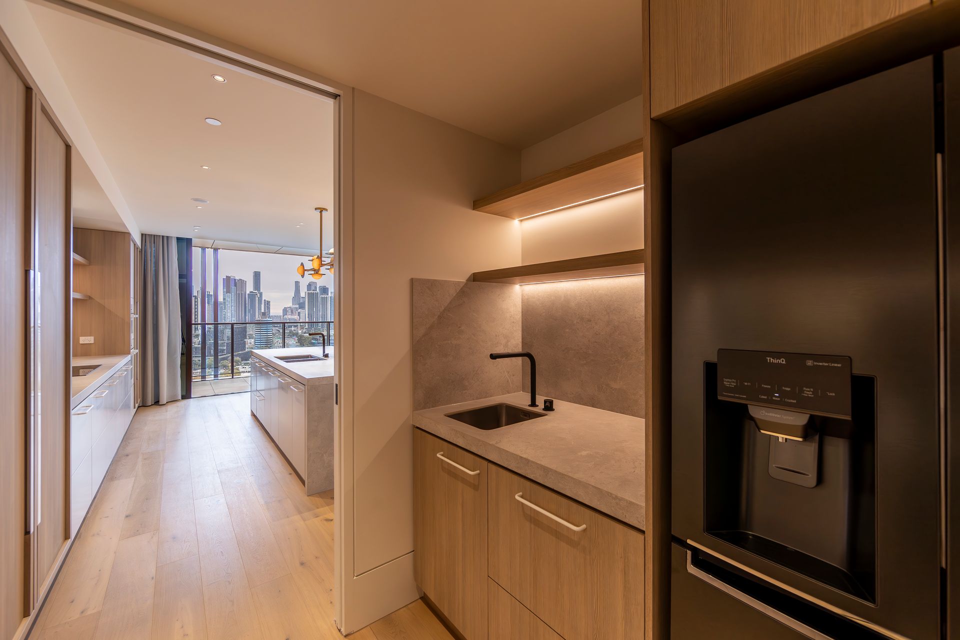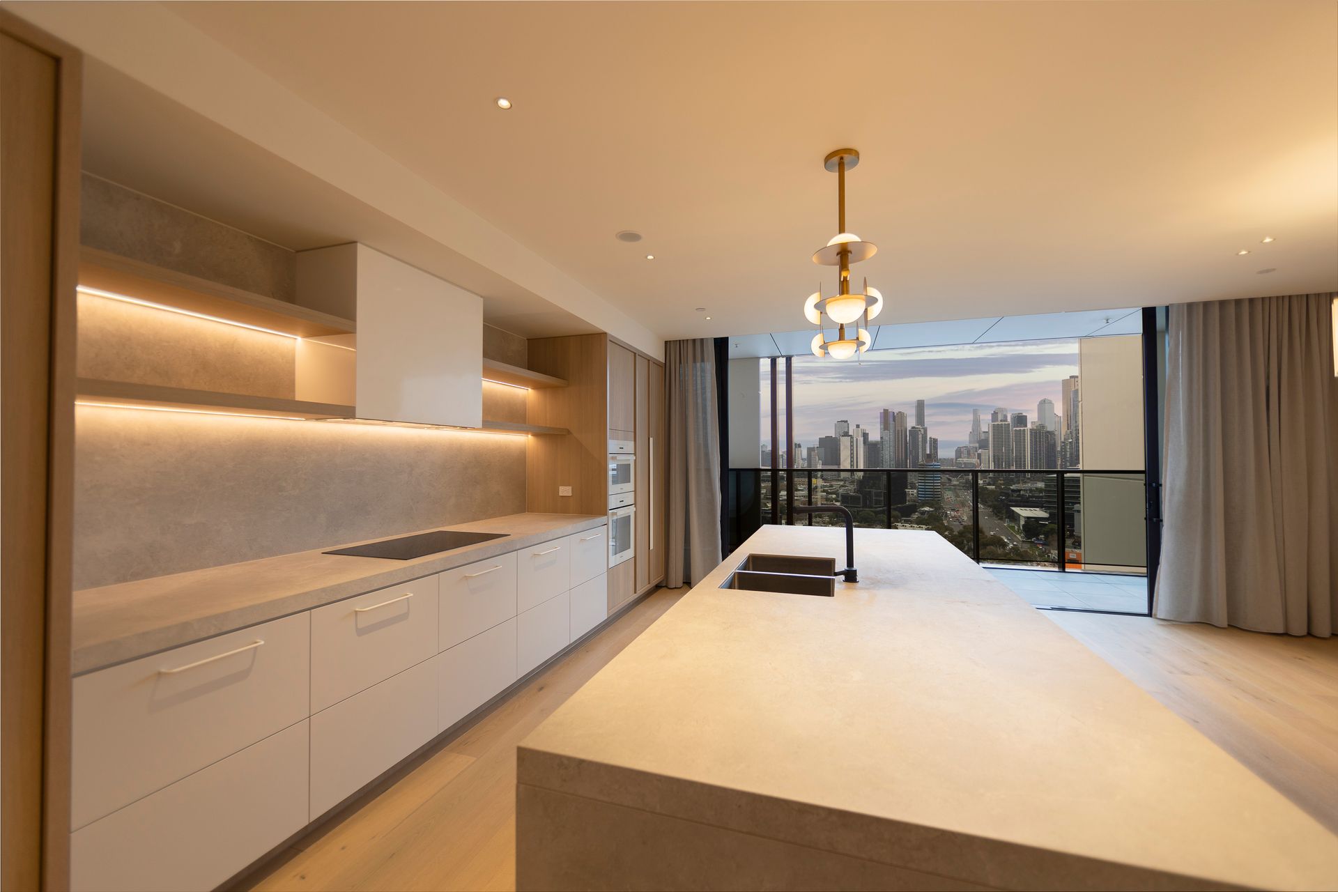 The Grace Penthouse stands out with its high-quality finishes and sophisticated design elements, offering a luxurious living experience. The penthouse boasts unparalleled views of Albert Park Lake and the Melbourne CBD, providing a stunning backdrop to everyday life. Due to access restrictions and the building's position, a high-risk crane lift was performed, showcasing the careful planning and execution of this exceptional project. The result is a blend of elegance and functionality, creating a refined and comfortable living space.